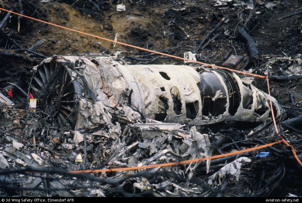 Boeing E-3B Sentry 77-0354 was military Boeing 707-derivative, a.o. equipped and AWACS system. The aircraft, operated by the US Air Force 962nd Airborne Air Control Sqn, 3rd Wing, was assigned call-sign Yukla 27 for a 6.2 hr training mission. At 07.43h Yukla 27 was holding short of runway 5, waiting for takeoff, when a Lockheed Hercules departed. This aircraft disturbed a flock of Canada geese. The Yukla 27 crew were not warned about this by the tower controller. At 07.45h they were cleared for takeoff and the throttles were advanced. As the plane rotated for lift-off numerous geese were ingested in the no.1 and 2 engines resulting in a catastrophic no.2 engine failure and a stalling no.1 engine. The crew initiated a slow climbing turn to the left and began to dump fuel. The aircraft attained a maximum altitude of 250ft before it started to descend. The plane impacted a hilly, wooded area less than a mile from the runway, broke up, exploded and burned.